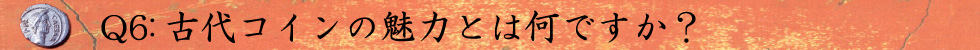 A6:古代コインの魅力は様々あると思いますが、当ギャラリーがお伝えしていきたいのは、小さな古代彫刻とも言える古代コインの美しさそのもの、そしてそれぞれのコインから読み取れる歴史ロマンです。