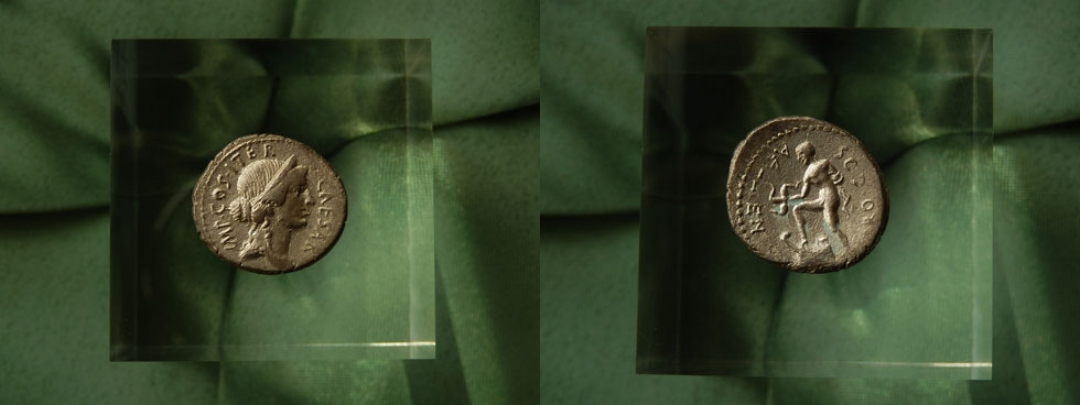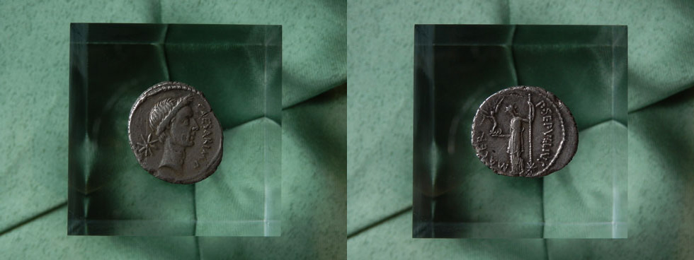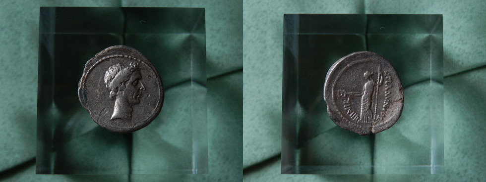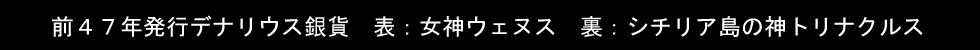 上写真のデナリウス銀貨は前47年にシチリア島リリュバエウム(現シチリア島マルサーラ)で発行された。