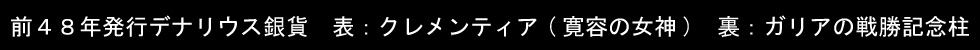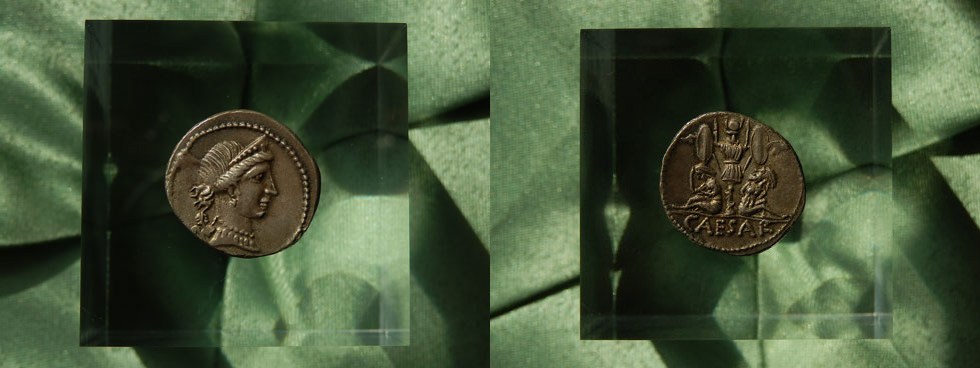 前48年、ファルサロスの戦い(前48年8月9日)での勝利の直後に、カエサルは上写真のデナリウス銀貨の発行を行った。