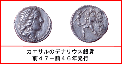 写真のカエサルのデナリウス銀貨とECCAIOSのブロンズ貨を比較しますと、表面のヴィーナスの髪型のデザインの影響を、ECCAIOSのブロンズ貨の肖像は受けていることがわかります。しかし、ヴィーナスの髪飾りの部分は、ECCAIOSの方は渦巻き文様というケルト的な要素が残されています。
