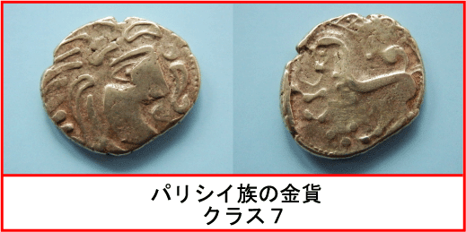クラス7のパリシイ族のコインは、クラス1に比べて金質が約2分の1になってしまいました。クラス7は、前52年頃に発行されたと推定されているヴェルキンゲトリクスと刻まれたアルウェルニー族の金貨と金質と外見が類似することから、同時期に発行されたと考えられてましす。すなわち、ガリア戦争時に発行されたと推測できます。