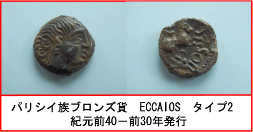 同じく、文字が刻まれたパリシイ族のブロンズ貨で、ECCAIOSと刻まれているタイプがありますが、このコインは前述のコインの発行より後に、パリシイ族にローマ文化が入ってきた頃に作られたと考えられています。
