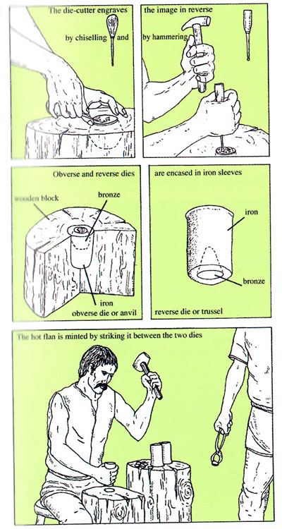 5、3で平面にされた金属片は熱いうちに、うち型の間に挟まれ、打刻される。