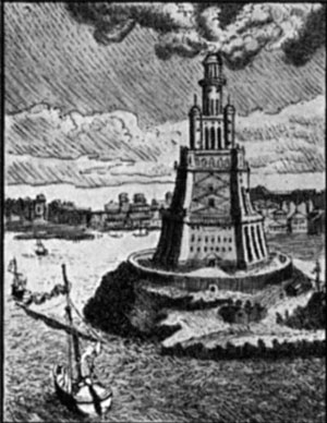 前3世紀、エジプト・アレキサンドリア沖にあるファロス島に建てられた巨大な灯台。高さは約130mあったとされ、灯台の光は50km以上の先からでも確認できたという。796年の地震により倒壊してしまったが、19994年に海底から灯台の痕跡とみられる遺物が発見された。