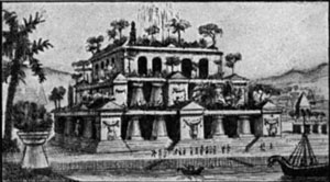 前600年頃、メソポタミアのバビロニア王ネブカドネザル2世が首都バビロンに王妃アミュティスのために建造した庭園。宮殿の中に作った階段状のテラスに土を盛り上から水を流し樹木や花などを植えた。あまりの大きさのため遠くから見ると空中に吊り下げられているように見えたという。