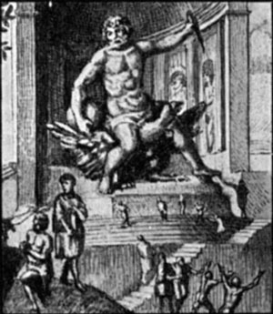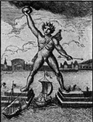 前3世紀、ロードス島の港に建てられた高さ約33mの青銅の太陽神ヘリオス像。ヘリオス像は港の入り口をまたぐように足を広げて立っていたと伝えられている。前226年の地震により倒壊。