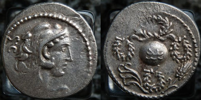 ポンペイウスの凱旋式を称えた勝利のリースが表された、スッラの息子のコイン
