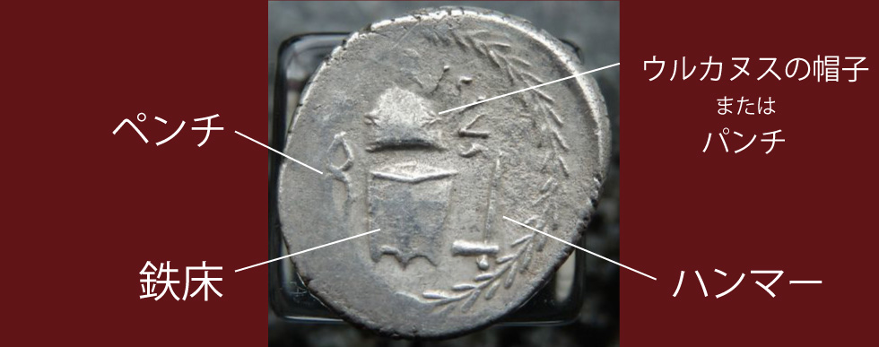 共和政期のローマコインには、ウルカヌスの鍛冶道具が表されたものがある。
