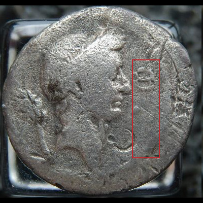 カドゥケウスが刻まれたユリウス・カエサル肖像のデナリウス銀貨 前42年発行