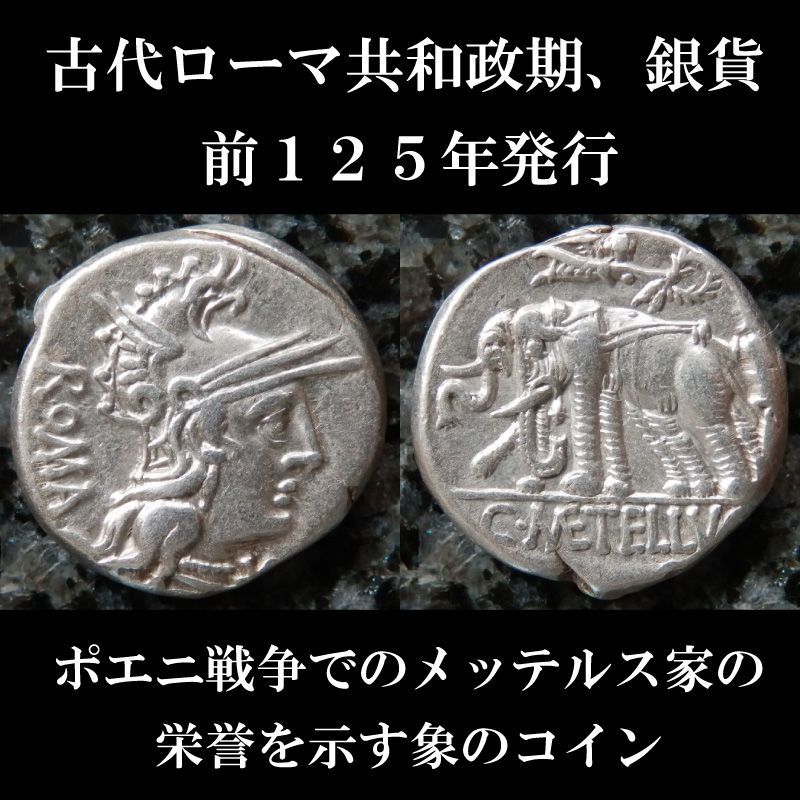 古代ローマコイン 共和政期 前125年 デナリウス銀貨 カエキリウス・メテッルス ポエニ戦争でのメテッルス家の栄誉を示す象のコイン