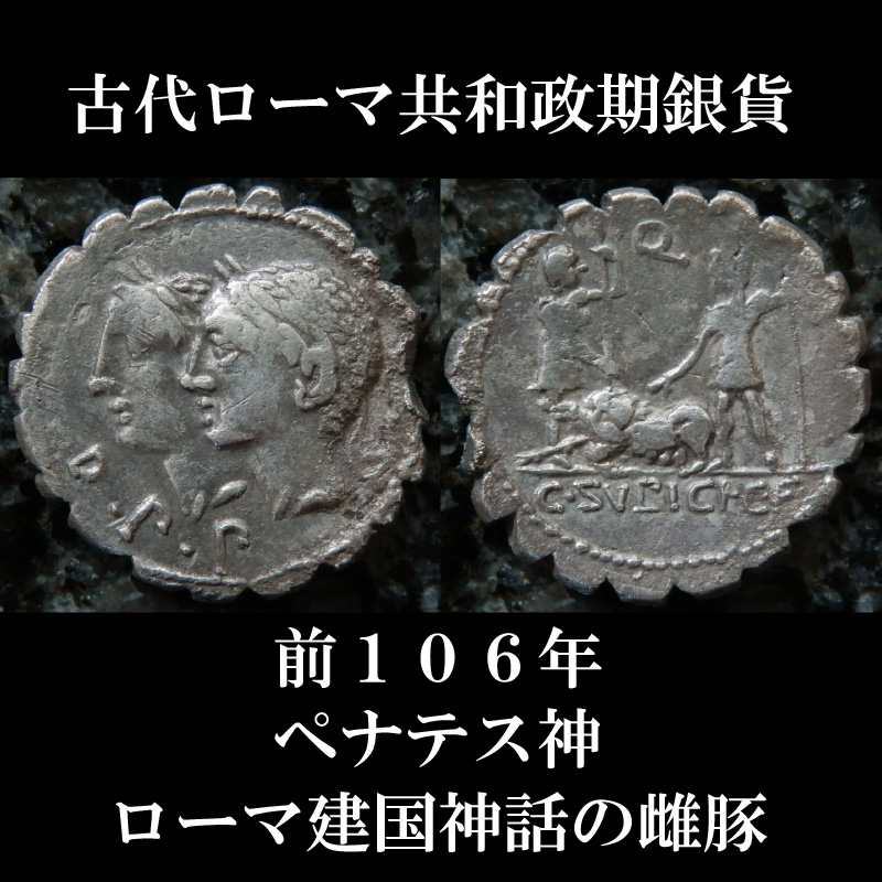 古代ローマコイン 共和政期 前106年 スルピキウス・ガルバ デナリウス銀貨 ペナテス(家庭・国家の守護神)の肖像 ローマ建国神話の雌ブタ