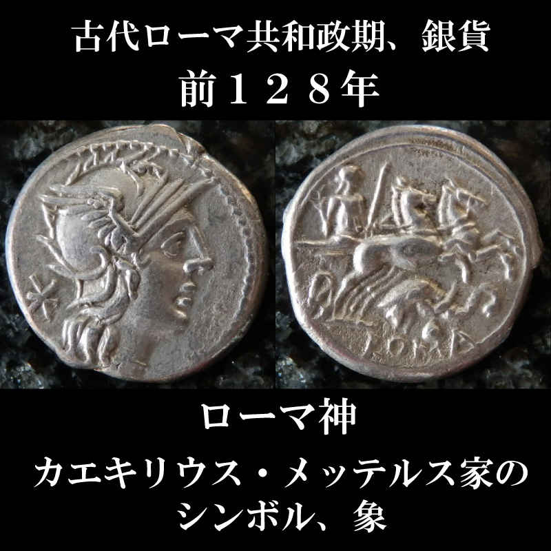 古代ローマコイン 共和政期 ルキウス・カエキリウス・メッテルス 前128年 デナリウス銀貨 ローマ神 2頭立て戦車と象の頭 カエキリウス・メッテルス家のシンボル、象