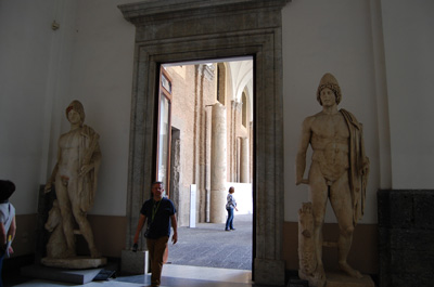 裸のディオスクロイ(カストルとポリュデウケス) それぞれ肩にマント、槍を持っている。馬2頭。