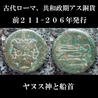オモテ面がヤヌス神、ウラ面が船というのは、ローマ初期のアス銅貨の定番意匠であった。