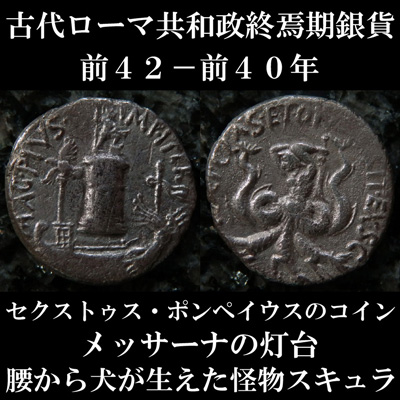 ポンペイウスの息子セクストゥス・ポンペイウスが前42-前40年にシチリアを占拠し、第2回三頭政治側と戦った時に発行したデナリウス銀貨。