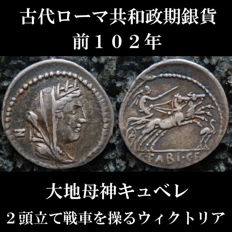 古代ローマコイン 共和政期 前102年 ファビウス・ハドリアヌス デナリウス銀貨 城壁冠のキュベレ神肖像 2頭立て戦車を操るウィクトリア神とサギ