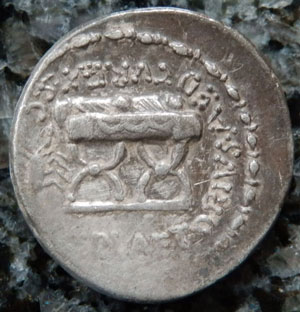 このコインの場合はAED CVR(Aedilis Curulis 貴族造営官)の銘も刻まれており、このセラ・クルリスはこのコインを発行した貴族造営官の権威を示している。