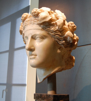オモテ面にはツタの冠をつけたバッカス(デュオニソス)の肖像が表されている。