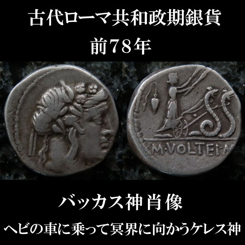 古代ローマコイン 共和政期 前78年 マルクス・ウォルテイウス デナリウス銀貨 バッカス神肖像 ヘビの車で冥界に娘プロセルピナを探しに行くケレス神