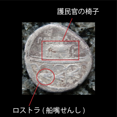 コインウラ面には、ロストラの上に乗った護民官用の椅子が表されている。