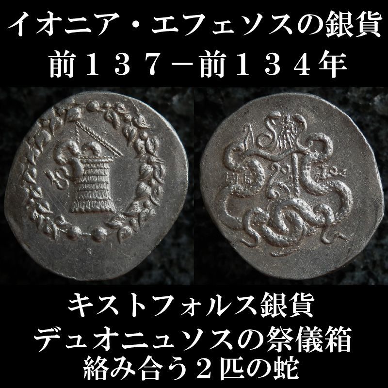 古代ギリシャコイン イオニア地方エフェソス 前137-前134年 キストフォルス銀貨 キスタから這い出る蛇(デュオニソスの秘儀の箱) 絡み合う2匹の蛇