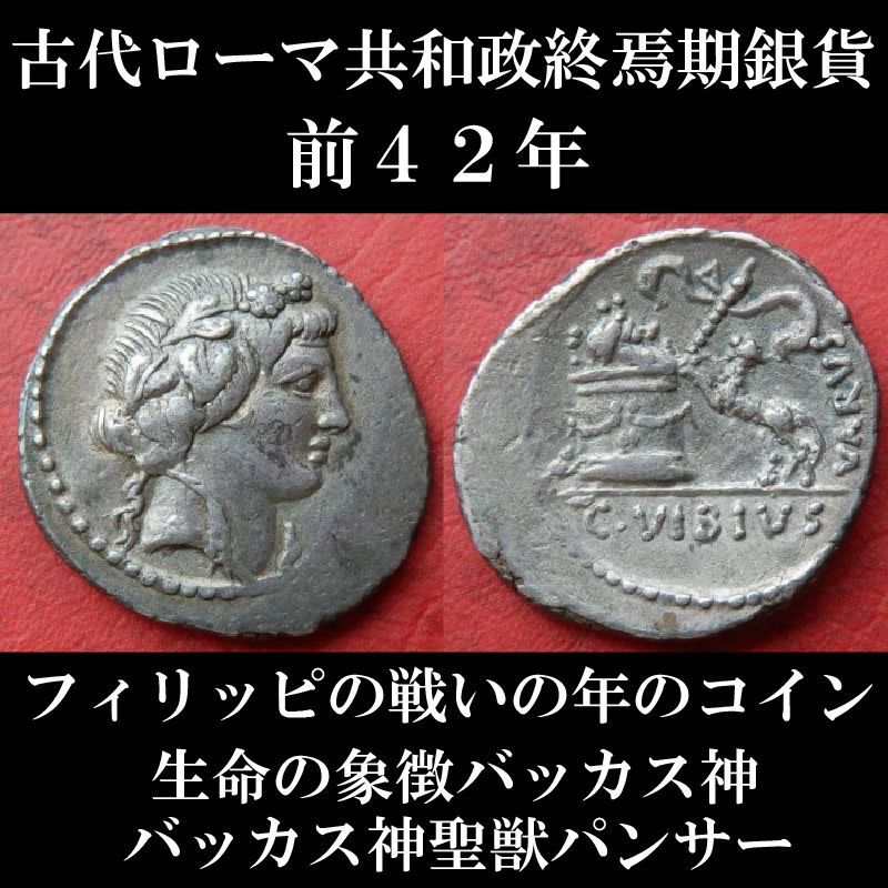 古代ローマコイン 共和政終焉期 ガイウス・ウィビウス・ウァルス 前42年 デナリウス銀貨 リベル神(バッカス)肖像 バッカス神聖獣パンサー フィリッピの戦いの年にローマで発行されたコイン