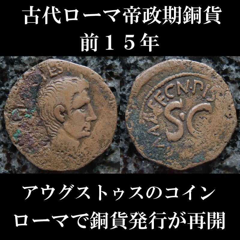 古代ローマコイン(額付き) 帝政期 アウグストゥス 前15年 アス銅貨 アウグストゥス肖像 金・銀・銅を扱う貨幣発行3人委員の銘 アウグストゥス、ローマでの銅貨発行を再開