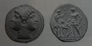 この意匠は、第2次ポエニ戦争時、前217年に、ローマで初めて発行されたスタテル金貨に使われた意匠のリバイバルである。