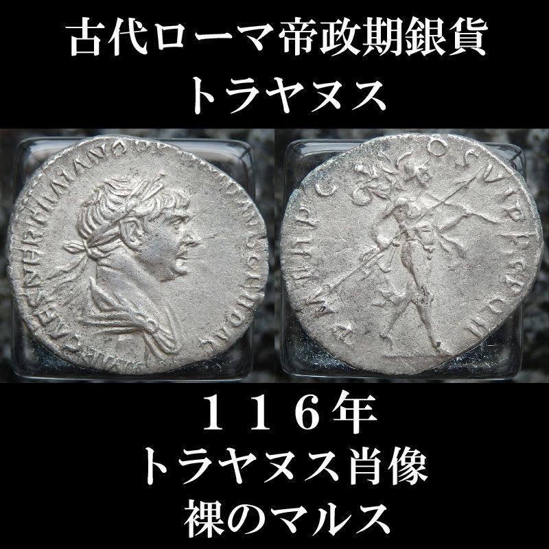 古代ローマコイン(額装付き) 帝政期 トラヤヌス 116年 デナリウス銀貨 トラヤヌス肖像 裸のマルス