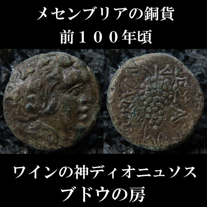 古代ギリシャコイン トラキア地域 メセンブリア 前100年頃 銅貨 ディオニュソス肖像 ワインの神ディオニュソスの象徴ぶどう 厚いディオニュソス信仰を示す意匠のコイン