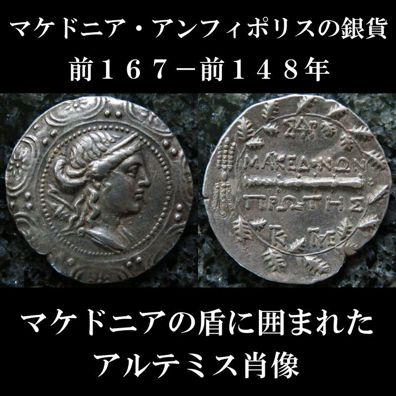 古代ギリシャコイン マケドニア・アンフィポリス テトラドラクマ銀貨 前167-前148年 マケドニアの盾に囲まれたアルテミス肖像