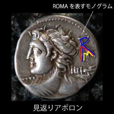 オモテ:見返るアポロンの肖像 右手には雷霆 右側のROMAを表すモノグラム