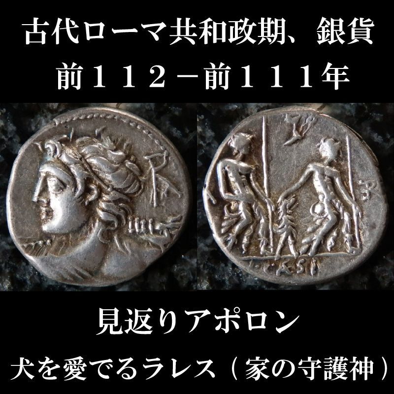 古代ローマコイン 共和政期 ルキウス・カエシウス 前112-前111年 デナリウス銀貨 見返りアポロン 犬を愛でるラレス(家の守護神たち)