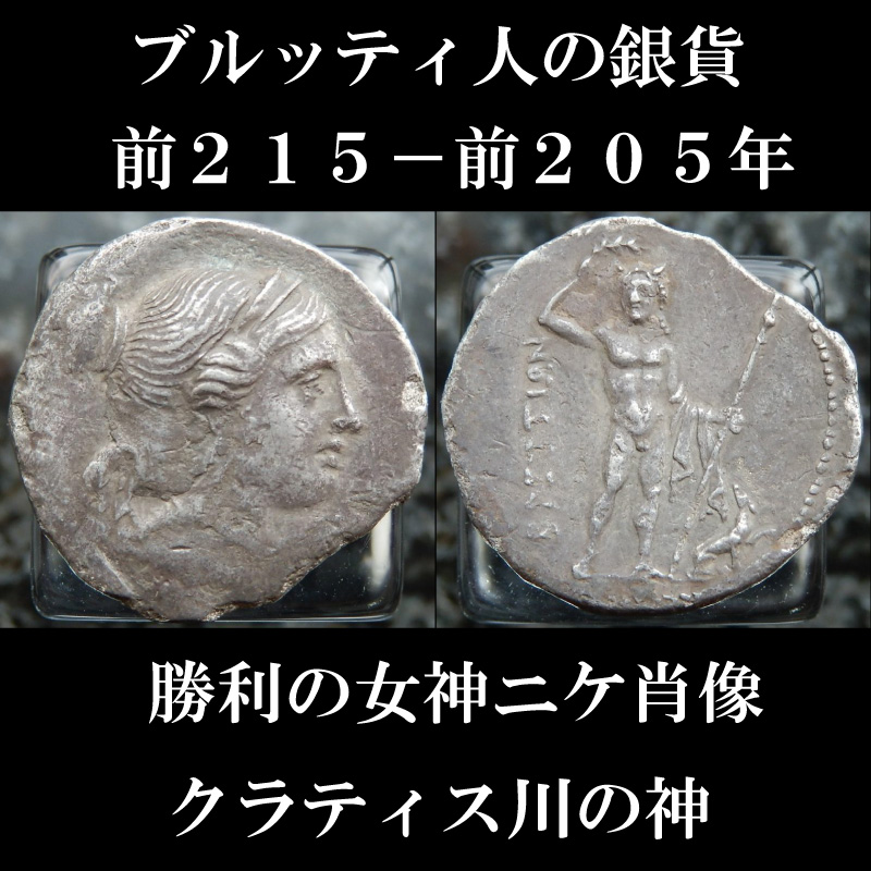 古代ギリシャコイン ブルッティウム地方 ブルッティ人 前215-前205年 ドラクマ銀貨 勝利の女神ニケ肖像 クラティス川の神の立像 第2次ポエニ戦争時カルタゴ側についたブルッティ人のコイン