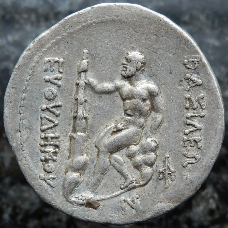 ウラ:BAΣIΛEΩΣ EYOYΔHMOY (王 エウテュデモス) 右手に持った棍棒を岩の上に置き、左手を岩について座る裸のヘラクレス