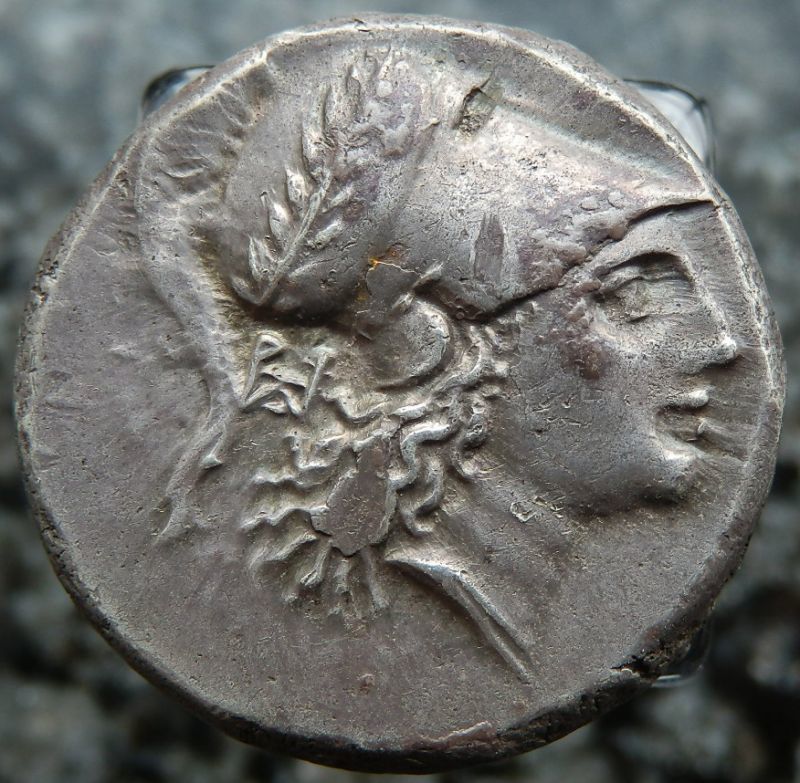 オモテ:月桂樹の葉で飾られた兜を被った右向きのアテナ神の肖像 アテナ神の首の後ろにはモノグラム