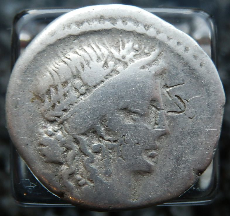 前48年のファルサルスの戦い(前48年6月6日、ギリシアの北に接するテッサリアの町ファルサルスで行われたポンペイウスとの戦い)の直後にギリシャで発行されたデナリウス銀貨。