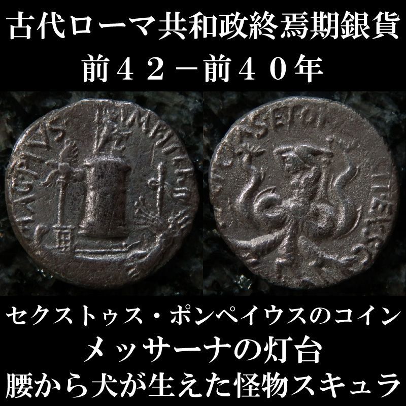 古代ローマコイン 共和政終焉期 前42-前40年 セクストゥス・ポンペイウス(ポンペイウスの次男) デナリウス銀貨 メッサーナの灯台 海の怪物スキュラ 第2回三頭政治に対抗したセクストゥス・ポンペイウスのコイン