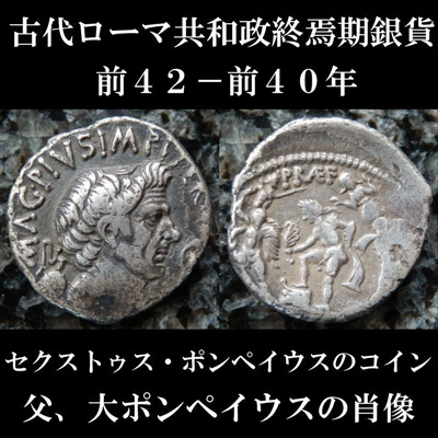 ポンペイウスの息子セクストゥス・ポンペイウスが前42-前40年にシチリアを占拠し、第2回三頭政治側と戦った時に発行したデナリウス銀貨。