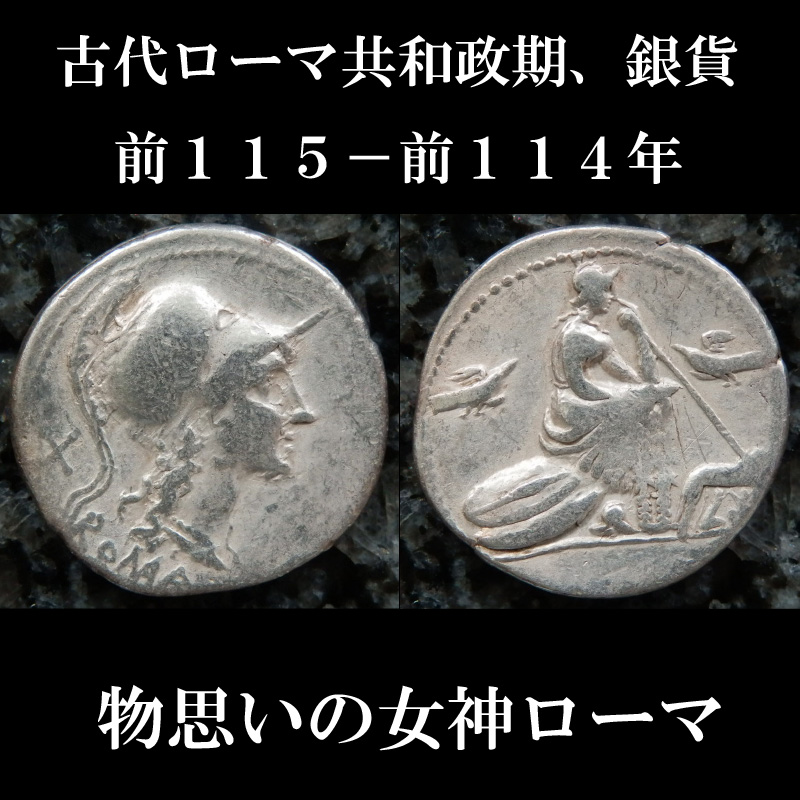 古代ローマコイン 共和政期 前115-前114年 デナリウス銀貨 ローマ神肖像 物思いのローマ神