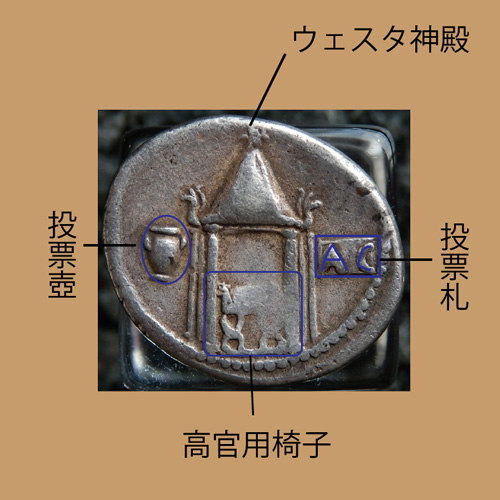 古代ローマコイン 共和政期 カッシウス・ロンギヌス 前55年 デナリウス銀貨 ウェスタ神肖像 ウェスタ神殿と投票札