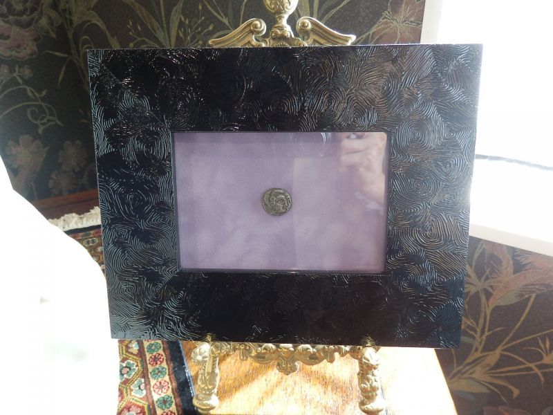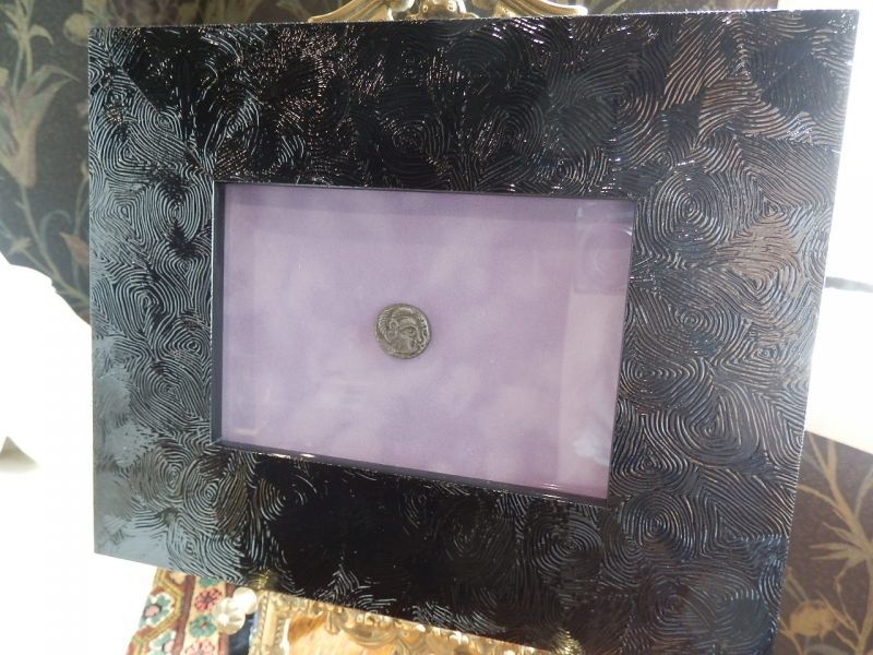 ガリア・コリオソリーテス族のアーモンド形の目をした美しい肖像の銀貨を古代ケルトを連想させる渦巻文様の額におさめました。