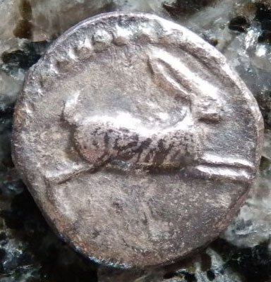 - > 古代ギリシャコイン(額装付き) ブルッティウム・レギウム 前 銀貨 駆けるウサギ 鏡文字