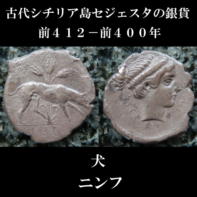 古代ギリシャコイン(額装付き) シチリア島 セジェスタ ディドラクマ銀貨 前412-前400年 頭を下げる犬 可憐なセジェスタのニンフ