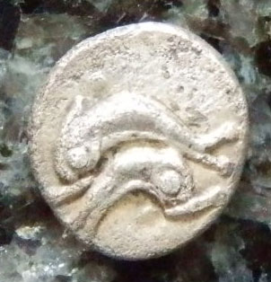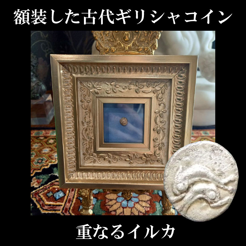 古代ギリシャコイン(額装付き) トラキア地域 タソス島 オボル銀貨 前412ー前404年 重なるイルカ