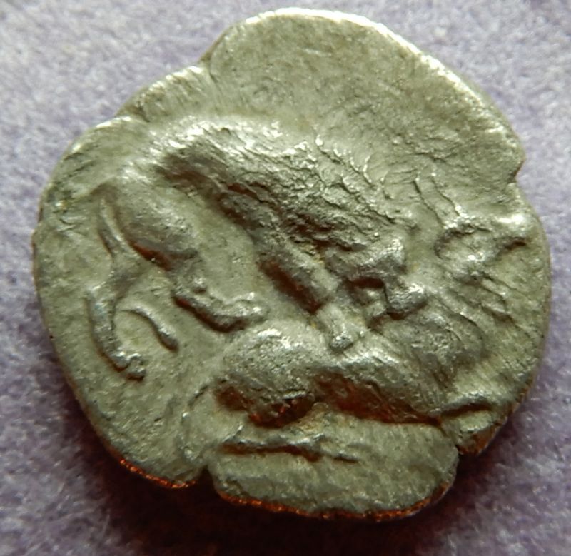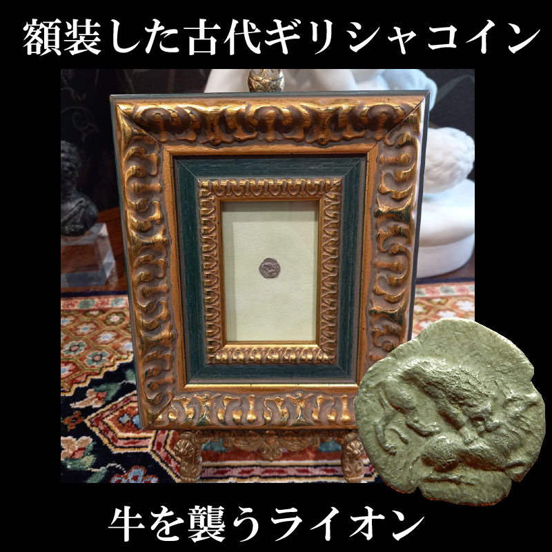 古代ギリシャコイン(額装付き) キリキア タルソス オボル銀貨 前361-前334年 牛を襲うライオン