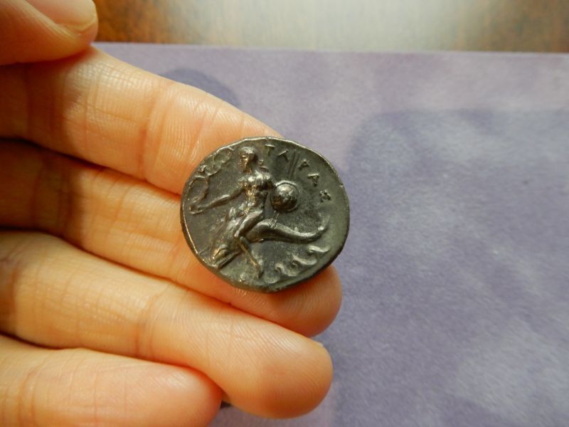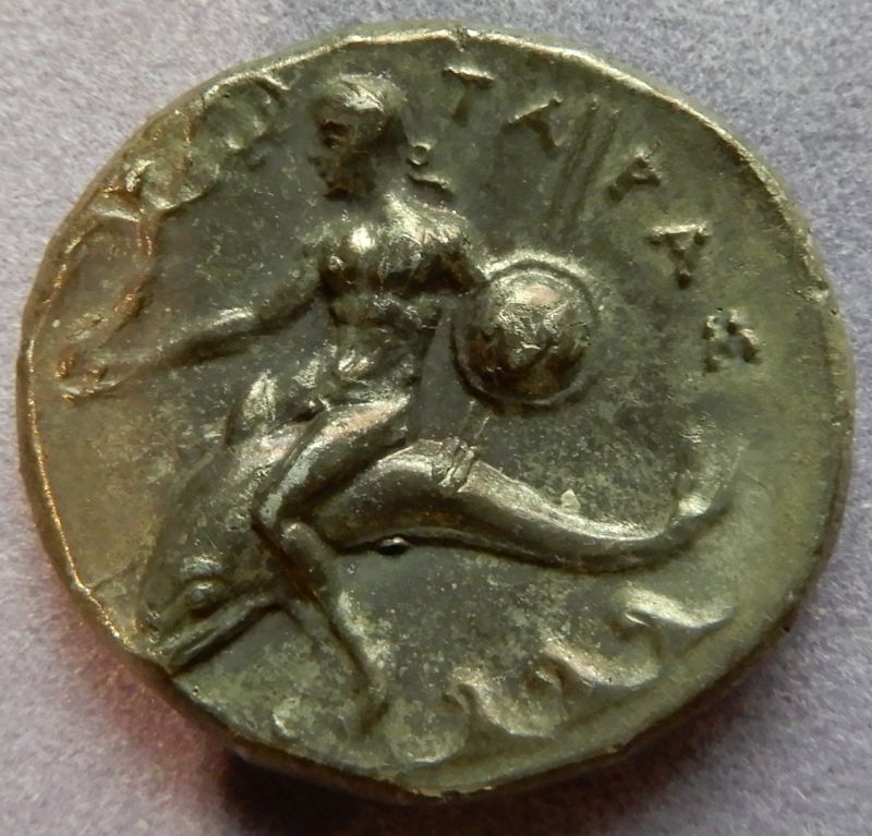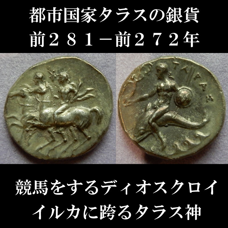 タラスでは前415年頃から、オモテ面に馬に乗った裸の騎手、ウラ面にイルカに乗った少年が表されたコインが発行されていった。
