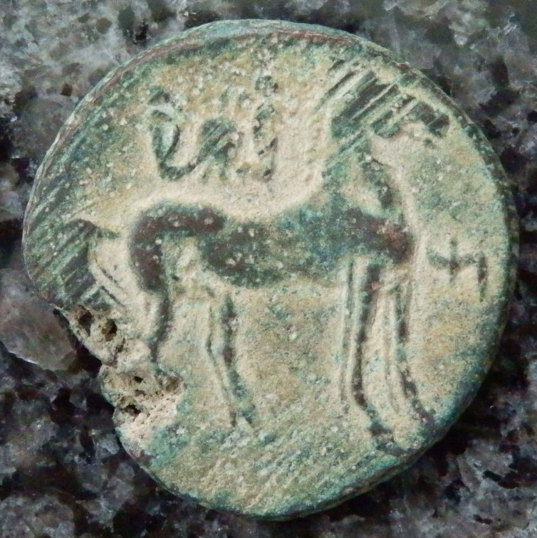 ウラ:右向きの馬、その上にはウラエウス(エジプトコブラをかたどったもので、絶対権力を表す)