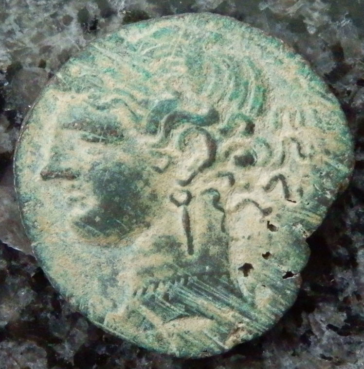 オモテ:麦穂の冠と耳飾りをつけた、左向きのタニト(フェニキアの大女神アシュタルテにカルタゴでつけられた名、カルタゴの守護女神として祭られた)