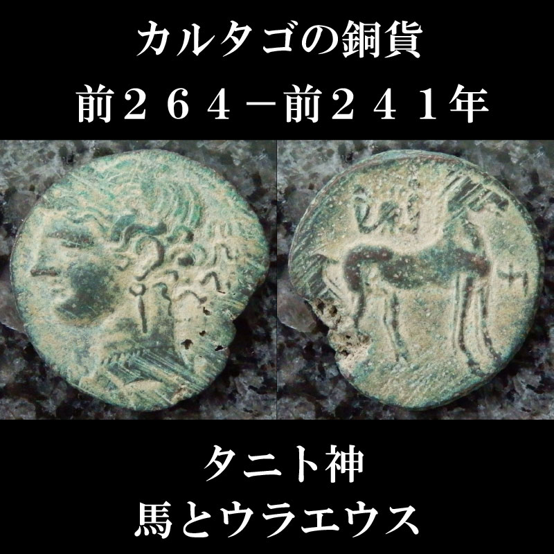 古代ギリシャコイン(額装付き) カルタゴ 銅貨 前264-前241年 カルタゴの守護女神タニト 馬とウラエウス